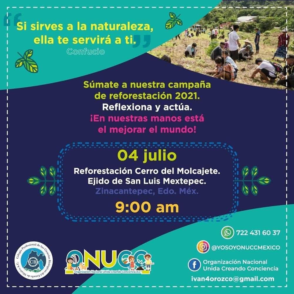 Se extiende invitación a los familiares y colaboradores de CNTV para apoyar a la organización nacional unida creando conciencia (ONUCC) en la reforestación del cerro del molcajete en Ejido de San Luis Mextepec. Zinacantepec, Edo. Mex. El día 4 de julio 2021. El propósito es plantar 800 árboles en un horario de 8:00AM a 1:00 PM.